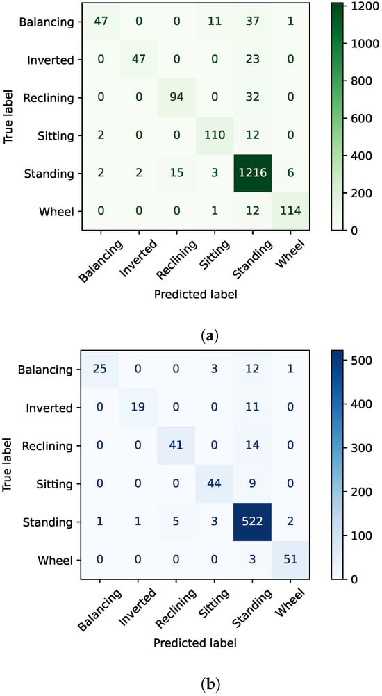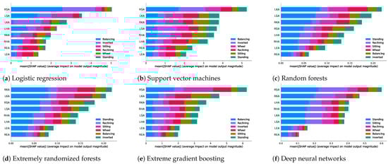 Figure 3 shows the confusion matrix for the cross-validation and test results. Summary plots are used for the Shapley [36] values for each feature for feature importance. Shapley values are a concept borrowed from cooperative game theory for machine learning. The Shapley value gives us the average marginal contribution of a feature value to the final outcome. The Shapely plots in Figure 4 demonstrate the average contribution of each predictor to the final outcome for a given class as well as the overall model predictions. For instance, in the extremely randomized trees model, the LKA was the most predictive angle for class 4, but the RKA was the most predictive angle overall across all classes. It was also observed that the elbow angle features had the lowest contribution to the model performance uniformly across different sets of algorithms from kernel-based algorithms to tree-based algorithms to neural networks.