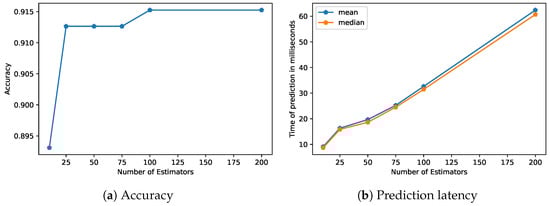 Table 6 demonstrates the prediction latency averages after running each model for 200 runs. In Figure 5, it can be observed that the test accuracy improved as the number of trees increased to 100. Although the best extra trees model used 100 trees, it can be observed that even with 25 trees, the extra trees models had an accuracy higher than those of the other models. With even as few as 10 trees, the extra trees models reached a similar performance to the next best model using random forests with 100 trees. For low-latency devices, a lower number of trees can be chosen, which can reduce prediction latency by three times with minimal loss to the accuracy.