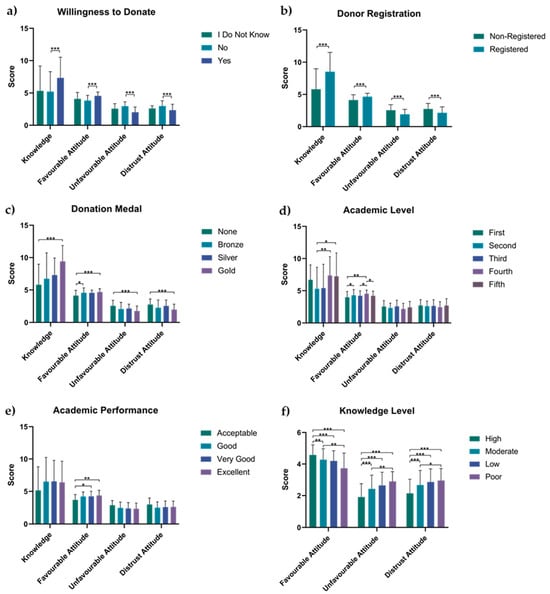 Group comparisons on overall knowledge, favorable attitude, unfavorable attitude, and distrust scores among nursing students who were willing to donate their organs and those who were not (a); nursing students who registered to donate their organs and those who did not (b); nursing students who received gold (agreed to donate all organs), silver (indicate accepting to donate two or more organs), bronze (awarded to donors of one organ), or no donation medal (c); nursing students at the first, second, third, fourth and fifth academic level (d); nursing students with excellent, very good, good and acceptable academic performance (e); and nursing students with a high, moderate, low and poor level of knowledge on organ donation (f). Bars represent the mean ± SD. * p < 0.05, ** p < 0.005, *** p < 0.001.