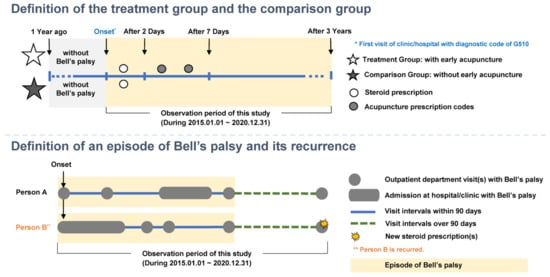 This retrospective cohort study analyzed patients with Bell’s palsy extracted from claim data from the HIRA from 1 January 2015 to 31 December 2017, with a follow-up period of at least 3 years until 31 December 2020. The recurrence rate of Bell’s palsy was compared in patients with and without acupuncture treatment in the acute phase to explore the impact of acupuncture treatment in the acute phase of Bell’s palsy. Acupuncture treatment in the acute phase was defined as acupuncture treatment provided within 7 days of diagnosis. The demographic and clinical characteristics were extracted and used for analysis to adjust for covariates in the two groups (Figure 1).