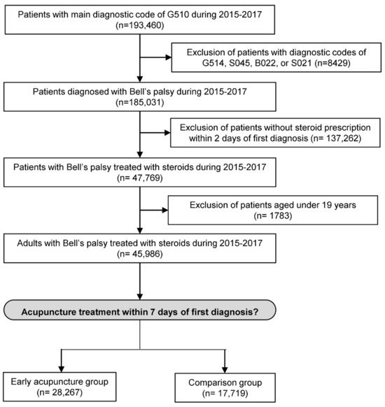 The study population was defined according to previous research [2,23]. The patients with Bell’s palsy were defined as meeting the following two criteria: (1) the first four digits of the main diagnostic code are “G510,” indicating Bell’s palsy, and (2) steroids are prescribed within 2 days of the first diagnosis. In the research, only patients diagnosed with Bell’s palsy were included, while patients with Ramsay Hunt syndrome or traumatic facial nerve palsy (G530 or B022) were excluded. Additionally, patients with additional diagnostic codes of facial myokymia (G514), injury of the facial nerve (S045), zoster with other nervous system involvement (B022), or fracture of the base of the skull (S021) were also excluded from the study. In addition, we included only adult patients aged 19 years or older in the analysis because pediatric patients are generally not treated with acupuncture due to concerns about pain. All types of hospital visits (ER visit, inpatient/outpatient, tertiary or secondary, primary hospitals) with Bell’s palsy as the main diagnosis were included. Patients who visited the hospital with the same diagnosis during the 1-year wash-out period were not included in this study in order to select only new-incident users with Bell’s palsy.
