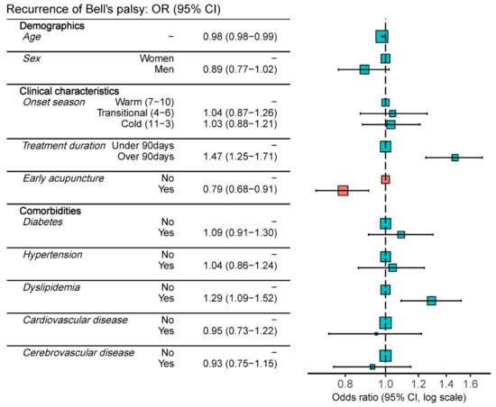 Forest plot of the adjusted odds ratios on the recurrence of Bell’s palsy. Red indicates the target intervention (early acupuncture treatment), while blue represents potential confounding factors.