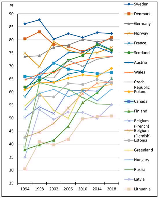 Time-trend analysis was performed using data from 20 countries/regions that conducted the survey in each of the seven HBSC study waves between 1994 and 2018. These countries/regions were Austria, Flemish and French-speaking Belgium, Canada, the Czech Republic, Denmark, Estonia, Finland, France, Germany, Greenland, Hungary, Latvia, Lithuania, Norway, Poland, Russia (European part), Scotland, Sweden and Wales (Figure 1). Hereinafter, the Flemish- and French-speaking regions of Belgium, as well as the Scotland and Wales regions of the United Kingdom, were considered independently as countries. Altogether, reports of 691,559 students who answered the questions on their toothbrushing behaviour and sociodemographic characteristics were included in this analysis: 86,238 students in 1994; 83,705 students in 1998; 97,518 students in 2002; 101,891 students in 2006; 107,617 students in 2010; 103,458 students in 2014; and 111,132 students in 2018 study. The overall response rate to the toothbrushing question across the survey waves was 99.3%. The data were obtained via the HBSC Data Management Centre (Bergen University, Norway). The HBSC protocol includes gaining ethics approval in each study country. As our study is based on secondary analysis of the datasets in which respondents did not participate directly, it was deemed unnecessary to obtain further ethical approval.