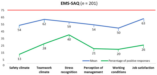 The average total score of the EMS-SAQ was 57.27 (SD = 13.81) (Table 2). The domain Working conditions had the lowest average rating (M = 49.91; SD = 17.37). Conversely, job satisfaction had the highest average rating (M = 63.18; SD = 17.19).