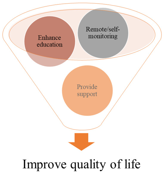 Systematic reviews and meta-analysis showed that TH solutions that support self-management could contribute to improve user’s skills in controlling COPD, especially those with transport or economic limitations, or geographical barriers [12,14]. Considering the high cost of health care services, the TH approach could lower costs while maintaining quality of treatment in primary care clinics, decrease the pressure on the specialty care clinics, deliver tailored care, and facilitate the coordination of care among healthcare professionals [15]. Also, TH could be an opportunity to facilitate education reinforcement for professionals, patients and/or caregivers [16]. Additionally, digital health allows for frequent reminders to be provided to users to practice behavior which strengthens an existing behavior, like self-monitoring and self-efficacy, or facilitates early interventions for COPD conditions by detecting their exacerbation at an early stage, and could therefore prevent unnecessary emergency visits and hospital readmissions [17,18], as shown in Figure 2.