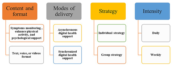TH solutions with COPD are multicomponent interventions (Table 3). Not all the TH solutions involved interventions [66]. There are studies of TH tools in the literature that only provided remote monitoring for COPD without any further interventions, even self-management or education [36,67], while others provided a virtual hospital at the patient’s home [6,34]. The mechanism of TH solutions is complicated, and depends on professional support as well as the standard care practice. To describe the mechanism of TH solutions that supported COPD management, we must consider four important factors: (1) content and format, (2) modes of delivery and level of technology, (3) strategy, and (4) the intensity of remote monitoring, which includes its frequency and duration, as shown in Figure 4.