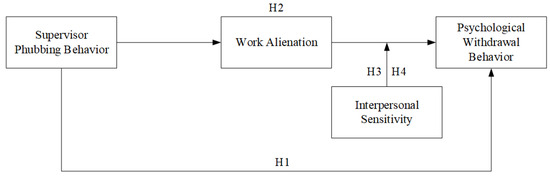 Psychological withdrawal behavior (PWB) is to withdraw from work conditions psychologically [33], reflecting hateful feelings and attitudes toward the workplace or job [34,35]. Significantly, the empirical study of Wang et al. (2022a) proved the social withdrawal behavior of children as the coping mechanism of parental phubbing behavior based on attachment theory [6]. The leader–follower relationship is similar to that of parent–child [36]. In the workplace, supervisor phubbing can be considered a perceived stressor for employees, which may result in negative emotions such as work alienation—the dissociative or separate state of employees in relation to the work product or process [37]. Work alienation embodies the disconnection between people and their work [38,39]. As an essential role of task accomplishment in organizations [40], a superior–subordinate relationship, especially a poor work relationship, can be a predictor of employee alienation at work [39]. As mentioned above, supervisor phubbing may negatively impact the superior–subordinate relationship, thus resulting in work alienation. The research of Shantz et al. [37] shows that work alienation positively impacts deviance, an essential dimension of counterproductive behavior [30,41]. The stressor-emotion model illustrates a causal flow from stressor perception to behavior via emotion [29]. Work alienation reflects a negative emotional and psychological state, and supervisor phubbing can influence employees’ psychological withdrawal behavior via work alienation.