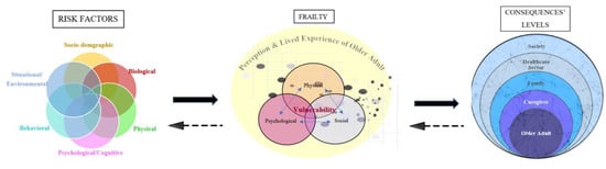 For the co-existing concepts with frailty, we reflected “aging” by adding the word “older adult” to the perceptions and lived experiences of frailty, which is in accordance with illustrating primary frailty in this paper rather than secondary frailty (caused by a certain disease) [71]. We wrote “vulnerability” in red at the center of the three frailty dimensions (physical, psychological, and social). Such a position of “vulnerability” reflects the possibility of it being present in one or more dimensions of frailty [14,25]. However, such vulnerability is again within the perception and lived experience of “clinically frail” older adults, given that vulnerability could imply a negative connotation.
