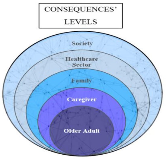 For frailty consequences, these happen at different levels (Figure 4). Frailty affects the individual, the caregiver, the family, the healthcare sector, and the wider community/society, as we previously presented. We utilized the stacked Venn diagram to illustrate these levels from the narrower to the wider level. We could not list all consequences of frailty cited in the literature in this diagram because some consequences can be classified under more than one level, such as institutionalization, which could be under the individual level and under the healthcare sector level. Also, consequences interact synergistically, not always in a predictable way. This supports the complexity of the frailty trajectory and its consequences, where mild physiological and psychosocial stressors increase the likelihood of adverse outcomes in frail older adults [15,16]. Interaction of consequences happens within and between levels. This diagram allowed us to show the overlapping and interconnectedness between these levels and within each level, appearing as complex background networks across and within levels. An example of the interaction across frailty consequences could be falls, fractures, fear of falling, and physical limitation. Within the individual level, falls can lead to fractures, and fractures can lead to physical limitation; falls can also lead to fear of falling [72], and fear of falling can lead to physical limitation [73]. Fractures with fear of falling might prolong physical limitation. An example of a between-levels interaction of consequences might be the surgical and medical complications of frailty at the individual level. Such complications necessitate more hospital visits and subsequently increase costs for the family, increase hospital length of stay, and utilize more social resources afterward [74,75]. On the other hand, more future frailty outcomes, whether negative or positive ones, are yet to be discovered.