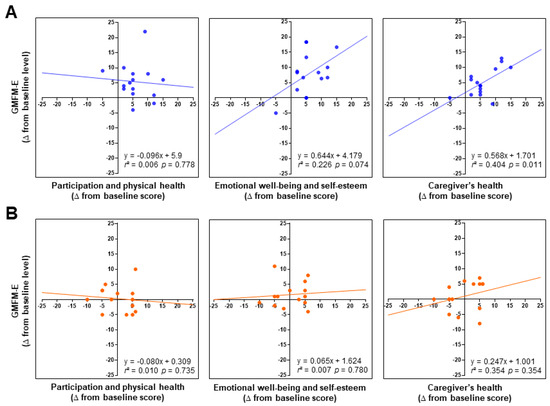 Data were expressed as a number (%) or mean ± SD (range). The Mann–Whitney U test was used to compare non-normally distributed data. Fisher’s exact test was employed. An analysis of variance (ANOVA) with post hoc Bonferroni–Dunn correction was used to compare continuous data that was normally distributed according to the D’Agostino–Pearson normality test. The linear relationship between the changes (△ from the baseline) in the statistically significant QOL domains of caregivers and children’s GMFM-E scores was visualized by scatterplots and the least-squares regression line for analyzing correlations within-group both before and after the program. Multivariate regression models were used to determine if data plots for each domain were related to improved GMFM-E scores in children who received hippotherapy.