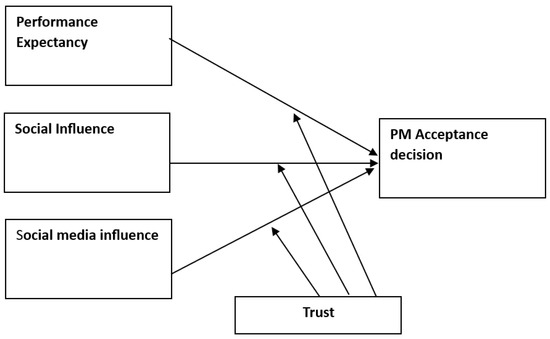 Trust in healthcare providers is a critical factor in patient decision-making, influencing acceptance of new healthcare interventions [35,36]. We posit that trust in doctors may moderate the relationship between antecedents (performance expectancy, social influence, and social media influence) and the PM acceptance decision. Specifically, individuals with higher levels of trust in their healthcare providers may be more influenced by the recommendations and opinions of healthcare professionals [37], potentially amplifying the impact of social influence and performance expectancy on their PM acceptance decision. Thus, we propose: