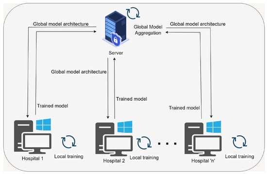 27]. This technique enables the development of ML models by enabling them to integrate and consolidate information from multiple entities while ensuring that the data remains limited to its sources. The researchers employed a client–server architecture in their FL strategy, integrating Federated Averaging (FedAvg) as suggested by [