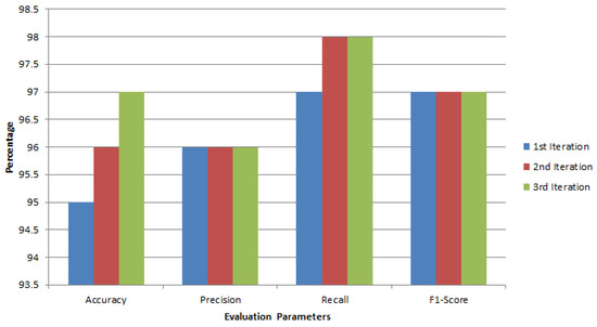 Figure 10 illustrates the progressive evolution of our global breast cancer detection model’s performance through numerical metrics. It displays the accuracy, precision, recall, and F1-Score across three iterations. Notably, the graph reveals a steady improvement in the model’s capabilities over time. In the first iteration, all performance indicators, such as precision, recall, precision, and F1-Score, exhibit considerably lower values. However, as the model undergoes refinement, which is particularly evident in the third iteration, there is a remarkable enhancement across all these crucial evaluation criteria. Of particular significance is the F1-Score, a comprehensive measure of the model’s overall performance. It exhibits a notable ascent from 97% in the first iteration to a robust 97.24% in the third iteration. This substantial increase indicates that the model has become significantly more accurate, precise, and efficient at capturing relevant instances while minimizing false negatives. Overall, the graph serves as a promising indicator of the model’s potential. It vividly illustrates the model’s progressive improvement, underlining its increasing effectiveness in accurately detecting breast cancer cases based on numerical data. This upward trend instills confidence in the model’s ability to continually enhance its diagnostic capabilities, ultimately benefiting medical applications and patient care.