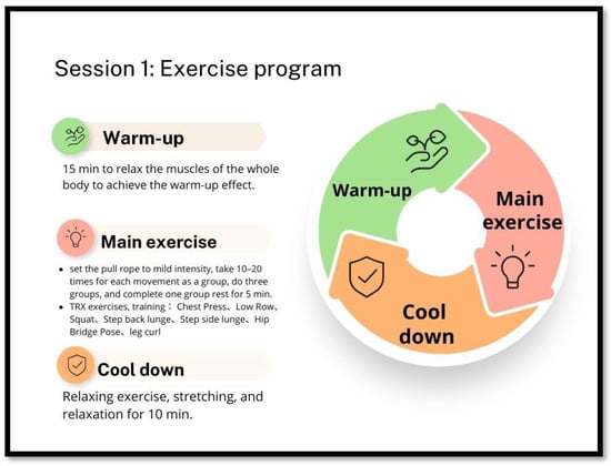 The exercise program of this research was designed in terms of frequency; the group exercise training will be implemented twice a week. In terms of intensity, participants will be reminded to consciously feel their body so that they can feel ‘a little sore, a little tight, but not too tired or too tight. The exercise intensity uses Borg’s Rating of Perceived Exertion (RPE) [39]. Participants in the Total Resistance Exercises (TRX) program will aim to achieve a target RPE of 13 (somewhat hard) while exercising.