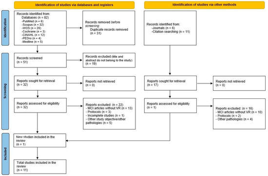 The literature search yielded a total of 82 articles from the electronic databases, of which 31 were duplicates. Of the 51 remaining articles, those that were unrelated to the study aim were removed (19), which resulted in a total of 32 articles. Those studies that did not combine VR with BMI, treated other pathologies, or were incomplete were removed, leaving 10 articles, which, together with those found by other means (1), yielded 11 final papers. The flow chart for the selection of the articles included in this SR was based on the PRISMA recommendations [30], displayed in Figure 1.
