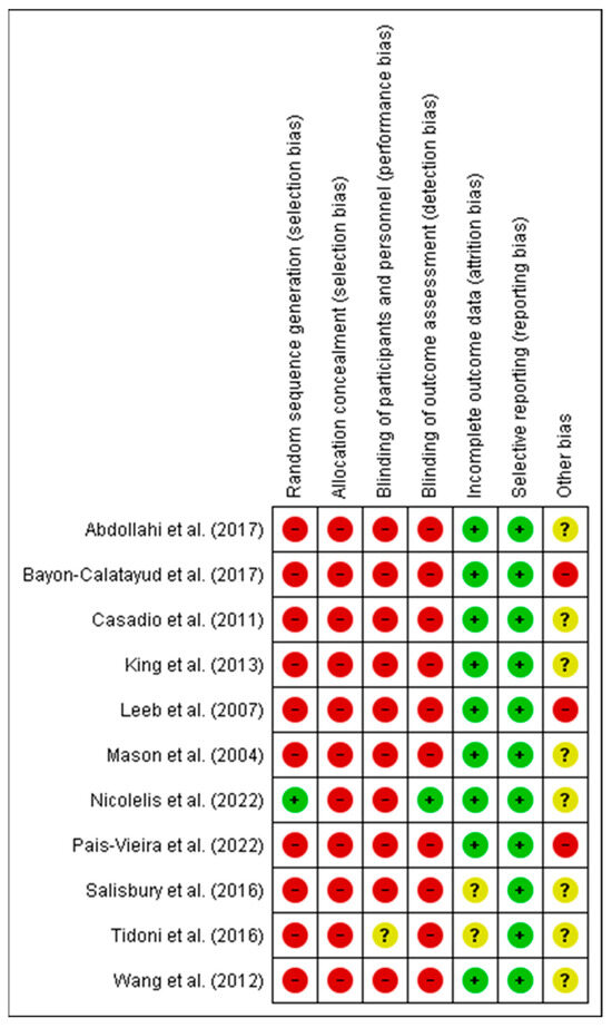 Figure 2 and Figure 3 show a summary of the risk of bias assessment of the included studies, both globally and individually for each study. When analyzed individually (Figure 2), the study by Nicolelis et al. [41] has the lowest risk of bias; conversely, the studies with the highest risk of bias are those by Bayon-Calatayud et al. [36], Leeb et al. [39], and Pais-Vieira et al. [42]. Overall (Figure 3), 100% of the biases appear when assessing performance biases. Furthermore, regarding the risk of bias among the analyzed studies, the lowest biases were found with the selective reporting of results (0%) and partial reporting (18%), while the highest value (100%) was found for allocation concealment.