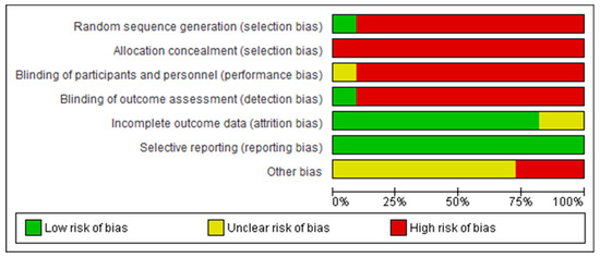 - Higgins, J.P.T.; Altman, D.G.; Gøtzsche, P.C.; Jüni, P.; Moher, D.; Oxman, A.D.; Savovic, J.; Schulz, K.F.; Weeks, L.; Sterne, J.A. The Cochrane Collaboration’s tool for assessing risk of bias in randomised trials. BMJ 2011, 343, d5928. [Google Scholar] [CrossRef]