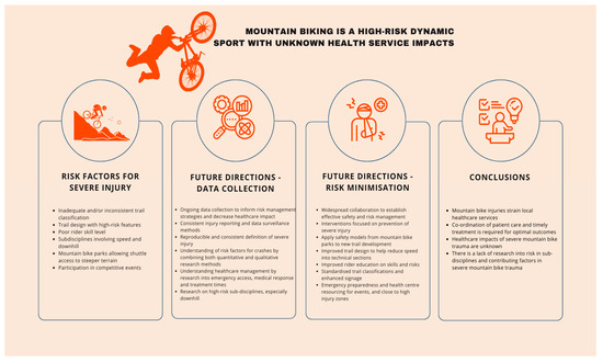Numerous studies have explored the incidence, characteristics, and demographics of MTB injuries, and noted their potential significant impact on healthcare. However, there is a lack of research investigating the specific healthcare impacts and whether increased participation in different subdisciplines exposes more riders to severe injury risks. Severe injuries can place strain on local healthcare services, where the coordination of care and timely treatment is needed to improve patient outcomes. Further studies are necessary to understand healthcare impacts, identify risk factors contributing to the severity of MTB injuries, and ensure effective risk minimisation, optimal treatment, and the safe development of this evolving sport. Figure 1 summarises the future directions and conclusions of this review.