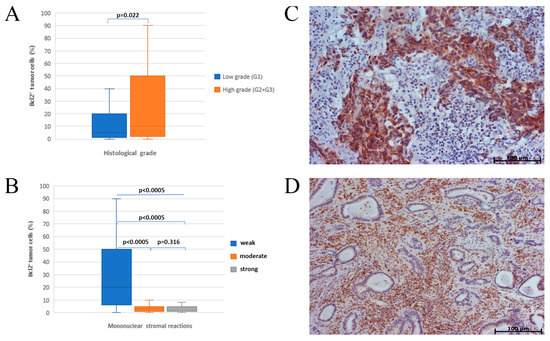 Association of Bcl-2 expression with histological grade and mononuclear stromal reaction; (A) influence of histological grade on bcl-2 expression; histomorphological presentation of positive correlation of bcl-2 expression and histological grade (C); inverse correlation of mononuclear stromal reaction and bcl-2 expression in adenocarcinoma (B); histomorphological representation of the intensity of mononuclear stromal reaction and bcl-2 expression in adenocarcinoma (D).