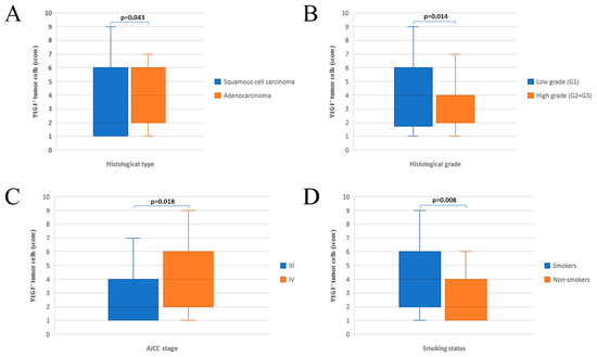 Immunohistochemical analysis was performed independently by two researchers, without familiarization with the clinical data of the studied population. In the case of preparations with different obtained values, the final result was reached by consensus. Cytoplasmic expression of VEGFa was determined by a semiquantitative method, as a product of the percentage of positive tumor cells and the intensity of the reaction, according to the recommendations of Klein et al. [25]. Percentual expression, i.e., the number of VEGF positive per 100 counted tumor cells, was classified into four categories: 0—absence of immunoreactivity, 1 <30%, 2 31–60% and 3 >61% immunoreactivity, while the staining intensity was graded as follows: 0—no staining, 1—weak; 2—mild and 3—strong staining. By multiplying these values, VEGF expression in all NSLC samples was scored from 1 to 9. Specifically defined, the cutoff point to distinguish low from high VEGF expression was 25% of positive carcinoma cells [26].