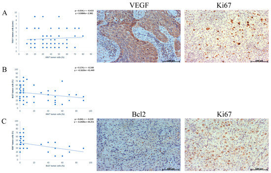 Association of the proliferation index with the expression of VEGFa and Bcl-2. (A) graphic and histomorphological presentation of positive correlation between VEGF and the Ki-67 proliferation index in NSCLC patients; (B) relationship between Ki-67 proliferative index and bcl-2 expression in NSCLC patients (C) graphic and histomorphological presentation of inverse correlation between Bcl-2 and the Ki-67 proliferation index in adenocarcinomas.