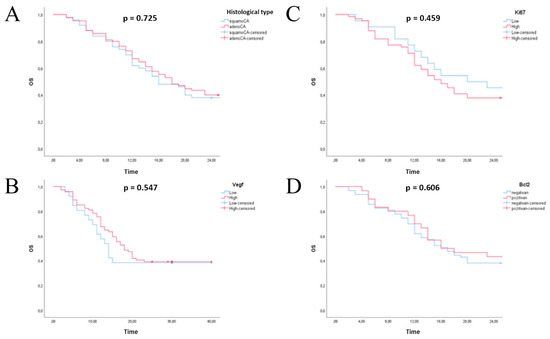 Kaplan-Meier overall survival analysis of patients with non-small lung cell carcinoma. (A) histology type; (B) expression status of VEGF; (C) expression status of Ki67; (D) expression status of Bcl-2.