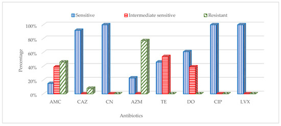 Resistance patterns of Escherichia coli isolates against the following antibiotics: doxycycline (DO, 30 mcg), ceftazidime (CAZ, 30 mcg), gentamicin (CN, 10 mcg), ciprofloxacin (CIP5, 5 mcg), azithromycin (AZM, 15 mcg), amoxicillin/clavulanic acid (AMC, 30 mcg), levofloxacin (LVX5, 5 mcg) and tetracycline (TE, 30 mcg).
