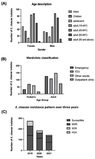 Demographic, clinical and baseline laboratory sample size distribution over a three-year period between (2019–2021). (A) Age description for male and female. (B) Ward/clinic description for pediatric and adult. (C) E. cloacae resistance pattern. MDR, XDR, PDR.