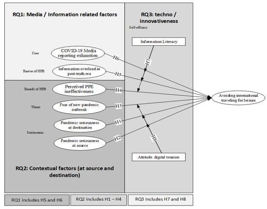 In terms of the behavior modeling to understand public readiness for tourism, several theoretical models can be noted as references. For instance: Cahigas, et al. [] extended the Theory of Planned Behavior (TPB), underlining the conceptualization to determine the factors that influenced Indonesian travel to Bali during COVID-19. Stylos, et al. [] extended the Affective Events Theory (AET) to examine tourist attitudes and behavior with the goal of better understanding the travelers’ on-board bus tour experience to strengthen the role of affect in tourism management. In light of the COVID-19 pandemic, [] The Health Belief Model (HBM) and Value-Belief-Norm (VBN) were integrated to provide a theoretical foundation for a decision-making strategy for preventive travel. Ohnmacht, et al. [] developed an integrated model based on the TPB and HBM and measured general risk-taking behavior in the case of COVID-19. Nazneen, et al. [] examined the impact of COVID-19 on travel avoidance concerning the protection motivation theory (PMT). To understand health-centric behavior, the Health Belief Model (HBM) can be considered one of the most interesting theoretical stances, as it offers a holistic view of persuasive psychological understanding []. It explains and predicts individual understanding of health-related concerns. The HBM was initially developed by Becker (1974) and modified by Rosenstock in the 1990s. It has been studied in the existing literature to map public health-centric behavior, i.e., smoking [], dental [], and influenza []. In recent years, the HBM has been adopted in several research initiatives to map concerns and public health protective behavior during the time of the pandemic. By adopting the HBM, [] categorized social media content uploaded during the COVID-19 outbreak, concentrating on information about the physical distancing procedures recommended by public health authorities. Similarly, Keren, Siddiquei, Anwar, Asmi and Ye [] used media self-efficacy and scientific efficacy along with the HBM to map the health-protective behavior in times of pandemic crisis. As the purpose of the current research was to emphasize health crisis-based situations, the HBM was therefore adapted. Specifically, along with the HBM’s fundamental factors, i.e., seriousness and perceived threat (fear) of COVID-19, the role of information and its related factors were considered while defining benefits, barriers, and cues to act. Moreover, self-efficacy in terms of information literacy was proposed to extend the novelty of the adapted theoretical stance.