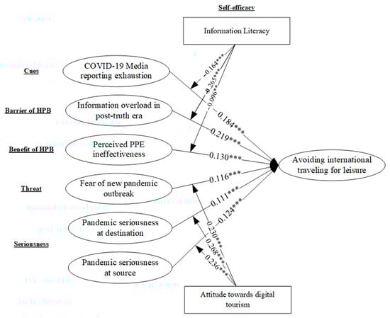 The moderating role of information literacy and attitude toward digital tourism was measured with the help of the hierarchical regression model. The study examines the moderating effect of information literacy of Chinese tourists on the relationship between COVID-19 media reporting exhaustion, information overload in the post-truth era and perceived PPE ineffectiveness and avoiding international traveling for leisure. H7, positing that information literacy dampens the relationship between COVID-19 media reporting exhaustion, information overload in post-truth-era and perceived PPE ineffectiveness, and avoiding international traveling for leisure, was supported by the results (H7a: β = −0.164; H7b: β = −0.265; H7c: β = −0.096, respectively). The finding highlighted the dark side of digitalization. The proliferation of conspiracies and misinformation populates doubts in the mind of individuals, which leads to avoidance behaviors. Information overload and complexity affect cognitive dissonance. To dampen these effects, information literacy plays a vital role. Similar trends were confirmed in the recent literature []. In the case of attitude towards digital tourism, it was noted to positively strengthen the relationship between fear of new pandemic outbreaks, pandemic seriousness at the destination and source, and avoiding international traveling for leisure (H8a: β = 0.230; H8b: β = 0.268; H8c: β = 0.236), which is also argued by Chua et al. []. Diffusion of innovation in the adoption of technology positively influences individual attitudes towards alternatives to tourism, i.e., digital tourism, which corresponds with the existing literature []. The results in tabular format are listed in Appendix A.