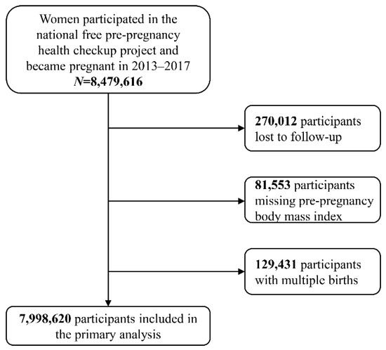 In the current study, a total of 8,479,616 NFPCP participants who became pregnant from January 2013 to December 2017 were included. After excluding participants who were lost to follow-up, with missing BMI, and multiple births, 7,998,620 participants were included in the final analysis (Figure 1).