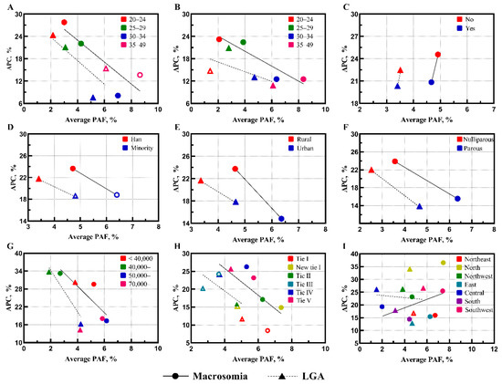 Within-Population Heterogenicity of Burden and Trends of Macrosomic and LGA Neonates Attributable to High Pre-pregnancy Body Mass Index. Legend: (A) = maternal age; (B) = paternal age; (C) = higher education; (D) = nationality; (E) = household registration; (F) = parity; (G) = GDP per capita; (H) = city tier; and (I) = region. The straight and dashed lines are the linear approximation of macrosomia and LGA, respectively. Hollow symbols represent annual percent change of nonstatistical significance (p > 0.05).
