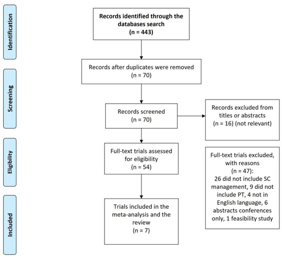 The systematic search identified 443 citations from EBSCO databases, of which 373 citations were duplicates. Consequently, 70 citations were screened from titles or abstracts, and 16 were considered not to be relevant. Of the 54 remaining studies, 47 articles were excluded: 26 were excluded because they did not include SC management/counselling, 9 did not include PT, 4 studies were excluded because they were not written in the English language, 6 were abstract conferences only, and one study was a feasibility study to pilot a new curriculum that includes SC in PT entry-level academic programmes (Table 2). Consequently, seven studies were included in the review. Figure 1 below represents the PRISMA flowchart for the included/excluded search records. The search identified no studies that have investigated the role of PTs in vaping cessation (Table 2). Table 2 is the data extraction table for the included seven studies. Three of the included studies (Bonder et al. 2011; Bonder et al. 2014; and Bonder et al. 2020) are from one big research project and have the same authors, similar titles, and sample, but with different goals in each.