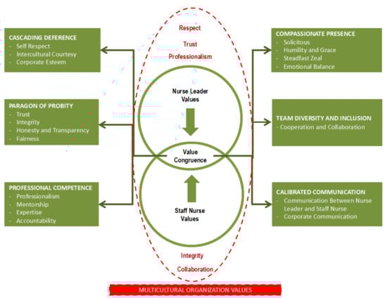 Cascading deference consists of the subthemes of self-respect, intercultural courtesy, and corporate esteem, which not only emerged as being vital to both staff nurses and nurse leaders, but was also among the top values sought in leaders for work settings where the employees comprise several nationalities with varied cultures and languages. Deference is defined by the Cambridge dictionary [] as “respect shown for another person especially because of that person’s experience, knowledge, age, or power”. This is similar to the context of deference sought by the nurses in this study, where they considered deference as a distinct moral duty of every individual to have positive attitudes toward human beings’ worth, concerns, and dignity, regardless of race, culture, or religion. In a culturally diverse work setting, the universal language is deference or respect. It is believed that respect and courtesy shown by the leaders toward the staff (and vice versa) as a leadership value and a corporate culture ensures a safe and comfortable work milieu where the staff from different countries can feel secure and inspired to deliver the services expected from them. The respect that they have for themselves drives nursing leaders to excel in the outstanding field of nursing []. Moreover, this demonstrates the presence of effective communication among intercultural teams and the provision of high-quality, secure patient care []. Nurses need to be more aware of both their own cultural perspectives and the cultural factors that affect intercultural civility []. Leng et al. (2021) found that nurses with high self-esteem have more resources for career flexibility and are more content with their jobs [].