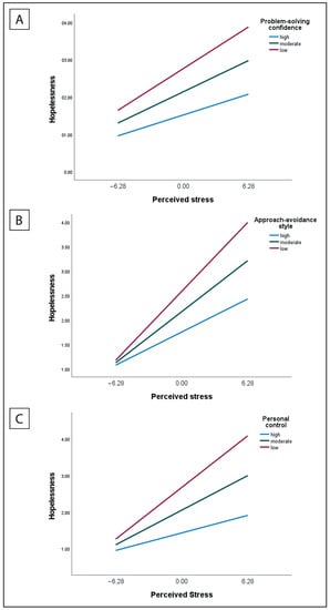The relationship between perceived stress and hopelessness at different levels of the dimensions of problem-solving appraisals. (A) = problem-solving confidence, (B) = approach-avoidance style, (C) = personal control.