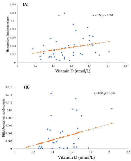 Pearson’s correlation showed no association between serum vitamin D levels with gut microbiota relative abundance in the overall sample. In the normal weight group, Pearson’s correlation showed a significant positive correlation between serum vitamin D and Bacteroides thetaiotaomicron species (r = 0.34, p = 0.02) (Figure 1A). In the group with obesity, a positive correlation was found between Bifidobacterium adolescentis species and serum vitamin D (r = 0.33, p = 0.04) (Figure 1B).