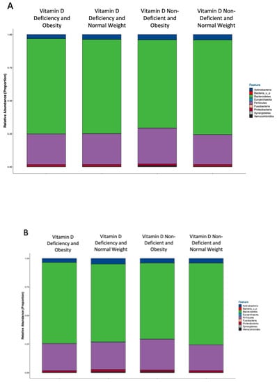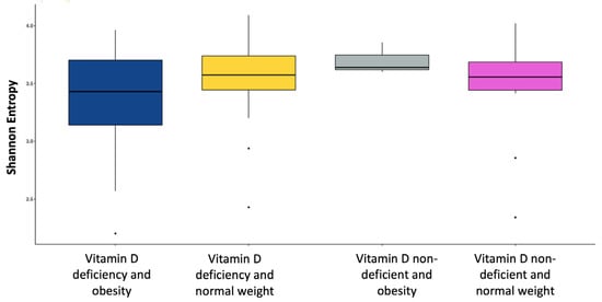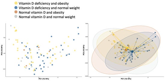 Our study found a significant difference in beta diversity between normal-weight and group with obesity based on vitamin D deficiency, with PC1 and PC2 accounting for 16.16% and 10.36% (p = 0.017). Similarly, a recent systematic review of human studies on the association between vitamin D and gut microbiota revealed that vitamin D supplementation and serum 25(OH)D levels are associated with significant changes in bacterial community composition [], emphasizing the variation of microbial communities between the study cohorts. In contrast, an interventional, open-label pilot study of 16 healthy adults showed that vitamin D supplementation significantly changed beta diversity in upper GI biopsies, but not in feces or lower gastrointestinal biopsies []. The variability in obtaining the sample from different anatomical parts of the GI tract or the technique used may lead to inconsistent results. Thus, the need for future studies addressing alpha and beta diversity, vitamins, and body weight is crucial to give insight into these associations.