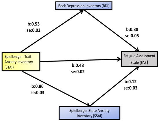 Mediation analysis of Beck Depression Inventory and Spielberger State Anxiety Inventory on Spielberger Trait Anxiety Inventory–Fatigue Assessment Scale relationship (Model 4 with multiple mediators).