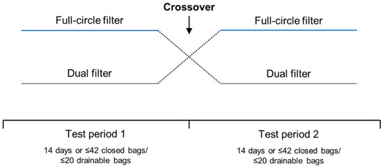 In each test period, participants used bags with one type of filter for 14 days or a maximum of 42 closed (participants with a colostomy) or 20 drainable (participants with an ileostomy) bags. Participants were instructed to change their ostomy solution as frequently as they usually would, or whenever they considered it necessary (including when ballooning occurred). If a participant used >42 closed or >20 drainable bags in <14 days, they were required to stop the test period early but were not excluded from the trial. At the crossover point, participants were instructed to continue using the current ostomy solution until a change was necessary. All participants were contacted by telephone at the crossover point (14 days) to ensure their well-being, to check that they were following the protocol, to clarify any issues with the ostomy solution, and to remind them to cross over. The trials did not include a washout period as it was assumed that any carryover effect would be negligible due to all ostomy solutions having the same type of adhesive and pouch. Furthermore, as the outcomes of the trials were related to device performance rather than direct biological or behavioral changes (e.g., skin issues or quality of life), a washout period was not considered necessary.