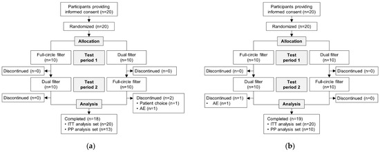 All outcomes were analyzed for the intention-to-treat (ITT) analysis set, which comprised people who were enrolled in the trial and who tested at least one study product. As a sensitivity analysis, the primary endpoint was also analyzed in the per-protocol (PP) analysis set. The PP analysis set comprised people in the ITT analysis set who completed the trial in compliance with the protocol, tested bags with each type of filter in consecutive order without using their own products, and used each type of filter for ≥11 days or a maximum of 42 closed or 20 drainable bags.