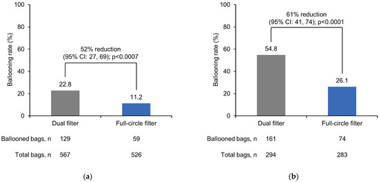 The frequency of ballooning was significantly lower with the full-circle filter compared with the dual filter in participants with a colostomy (p < 0.0007) and in participants with an ileostomy (p < 0.0001) (Figure 4).