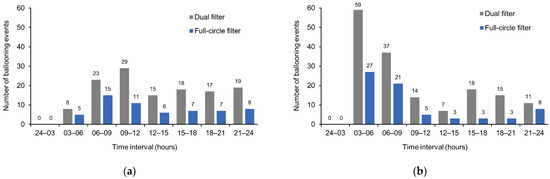 Distribution of ballooning events over 24 h with the full-circle filter and the dual filter in (a) participants with a colostomy (n = 20), and (b) participants with an ileostomy (n = 20). Data are presented for the ITT analysis set. Time intervals are indicated using the 24 h clock. ITT = intention-to-treat.