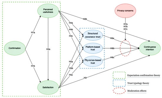 By analyzing these previous studies, we identified the following gaps: (1) There is no multidimensional perspective of trust available to explore why customers continue to use telemedicine; (2) There is no research on privacy issues related to perceived data misuse in telemedicine, which uses IoT as its technical context. To address this problem, in this study, we followed a modified expectation confirmation theory (ECT) [31,32] and employed the typology of trust developed in McKnight [33], which distinguishes between structural assurance-based trust, platform-based trust, and physician-based trust in telemedicine and can determine the relative impact of each category on the relationship of perceived usefulness, satisfaction, and continuance intention [34,35]. We also investigated the moderating effect of privacy issues on the relationship between trust and continuance intention.