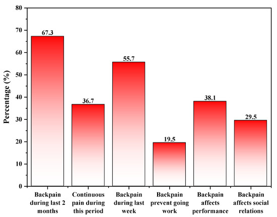 By asking the interviewed teachers about back pain, 67.3% of participants revealed that they had experienced back pain within the last two months, which was noted as continuous in 36.7%. The onset of pain during the last week was recorded among 55.7% of those with a back pain history. On asking about the consequences of having back pain, 38.1% of those who had the pain highlighted that it affected their performance, 29.5% stated that pain affected their social relations, and only 19.5% recorded previous absenteeism due to back pain (Figure 1).