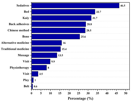 Sedatives, bed rest, kaiy, and local adhesives were the most common at-home management approaches, with only 9.9% consulting a primary care physician. Moreover, our findings highlight that sedatives are deemed to be the most effective pain-relieving method (34.2%), followed by body piercing (27.2%), exercising (21.3%), and physiotherapy (20%). The current literature corroborates the use of medications to treat this condition, with the guidelines from the American Pain Society and the American College of Physicians recommending paracetamol and NSAIDs as the first-line options for pain relief [17].