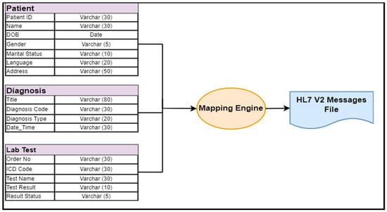 Therefore, we decided to develop a middleware engine to convert (i.e., map) the medical data stored in simple flat files—such as CSV files or database tables—into the HL7 v2 message format. This engine can take raw EMR data as inputs and produce HL7 v2 messages. It reads the data stored in a CSV file and automatically maps to an equivalent HL7 v2 message. We included a raw EMR dataset with a total of 53,410 records of patients’ demographic information, various lab test results from various types of labs, and diagnosis descriptions. Each data type was mapped to different HL7 v2 messages, because every HL7 v2 message has different segments and fields for each data element. Therefore, their mapping to HL7 v2 messages is also difficult. We used the Mirth engine tool for this data mapping—an open-source, cross-platform interface engine used in the healthcare industry for clinical data mapping and exchange purposes []. We created channels for each message and algorithmically mapped the EMR data to HL7 v2 message segments.