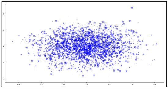 In the resulting cluster (Diagnosis), the diagnosis code and descriptions had numerous domain value categories. Therefore, the possibility of further classifications existed, for which we trained our model. We trained our model on this dataset (Diagnosis cluster), and the model classified this cluster into a further 2854 clusters based on diagnosis codes. We therefore believed that 2854 different types of diagnosis code existed in our dataset, and the model was trained to classify them. Our model successfully categorized this dataset into various clusters and generated the results. To show the results of all 2854 clusters is quite difficult. However, to give the reader a brief idea about this classification, in Figure 6, we show only the clusters, where each STAR (*) represents one cluster. The size of each STAR (*) represents the number of records in that cluster.