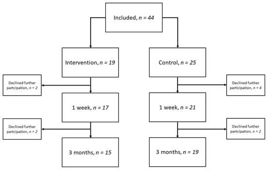 A total of 44 participants were included in the study, whereof 28 were from hospital A and 16 from hospital B. Of these, 19 participants received the intervention, and 25 did not. A total of six participants declined further participation at the 1-week follow-up and were not included in the final analysis. Additionally, four participants declined further participation at the 3-month follow-up; see the flow diagram in Figure 1. The median age of the 38 participants included in the analysis was 77 years (IQR 75–81); 55% were men, and 66% had a mild stroke. The participants lost to follow-up had a median age of 77 years (IQR 73–81), 50% were men and 50% had a mild stroke.