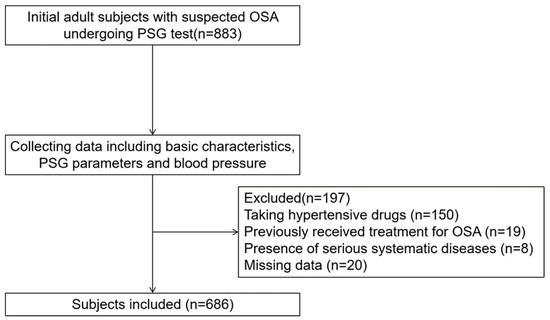 Adult patients with suspected OSA with symptoms of snoring receiving polysomnography (PSG) tests between January 2014 and August 2022 at the First Affiliated Hospital of Nanchang University were included. The exclusion criteria included taking hypertensive drugs previously (n = 150); previous OSA treatment (n = 19); serious systemic diseases (e.g., heart failure) (n = 8); and missing data (n = 20). A total of 686 patients with complete data were included (See in Figure 1).