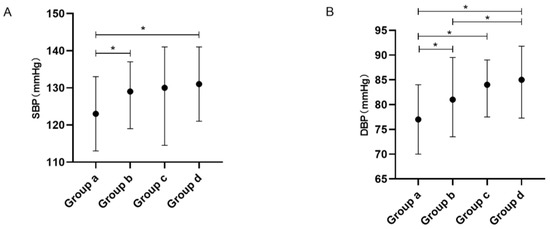 Blood pressure levels stratified by obesity and severe OSA. Footnote: Group a, non-obese with non-severe OSA group; Group b, non-obese with severe OSA group; Group c, obese with non-severe OSA group; Group d, obese with severe OSA group; subfigure (A), comparison of SBP level among the four gruops; subfigure (B), comparison of DBP level among the four groups; *, p < 0.05. Abbreviations: OSA, obstructive sleep apnea; SBP, systolic blood pressure; DBP, diastolic blood pressure.
